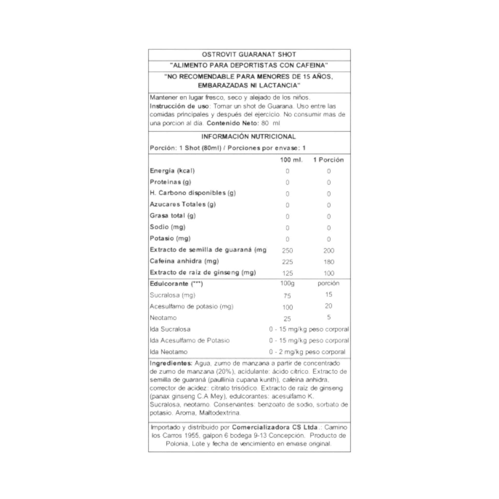 - 1 SHOT contiene guaraná, cafeína y ginseng