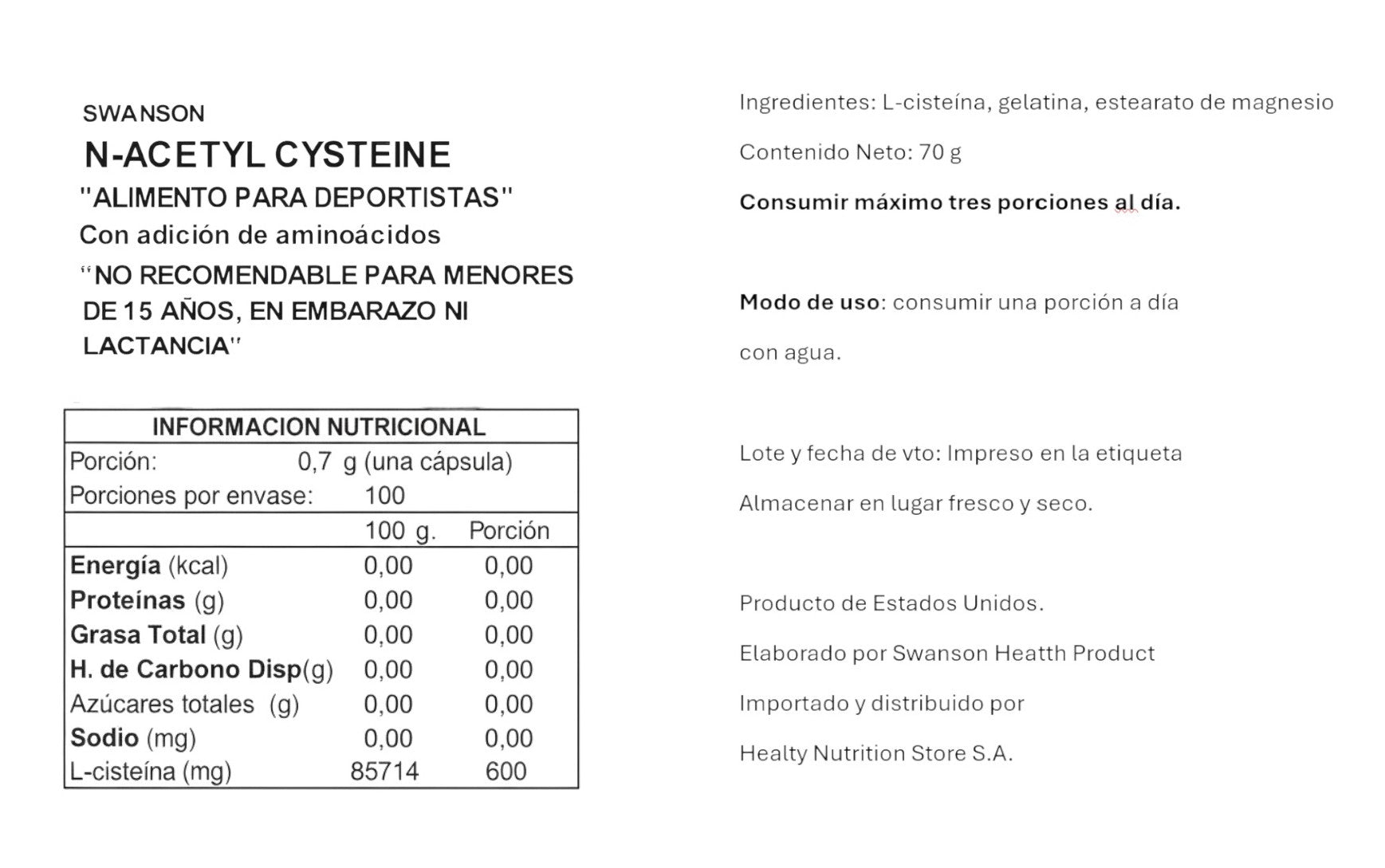 N-ACETIL CISTEINA (NAC) 600MG 100 CAPSULAS - SWANSON