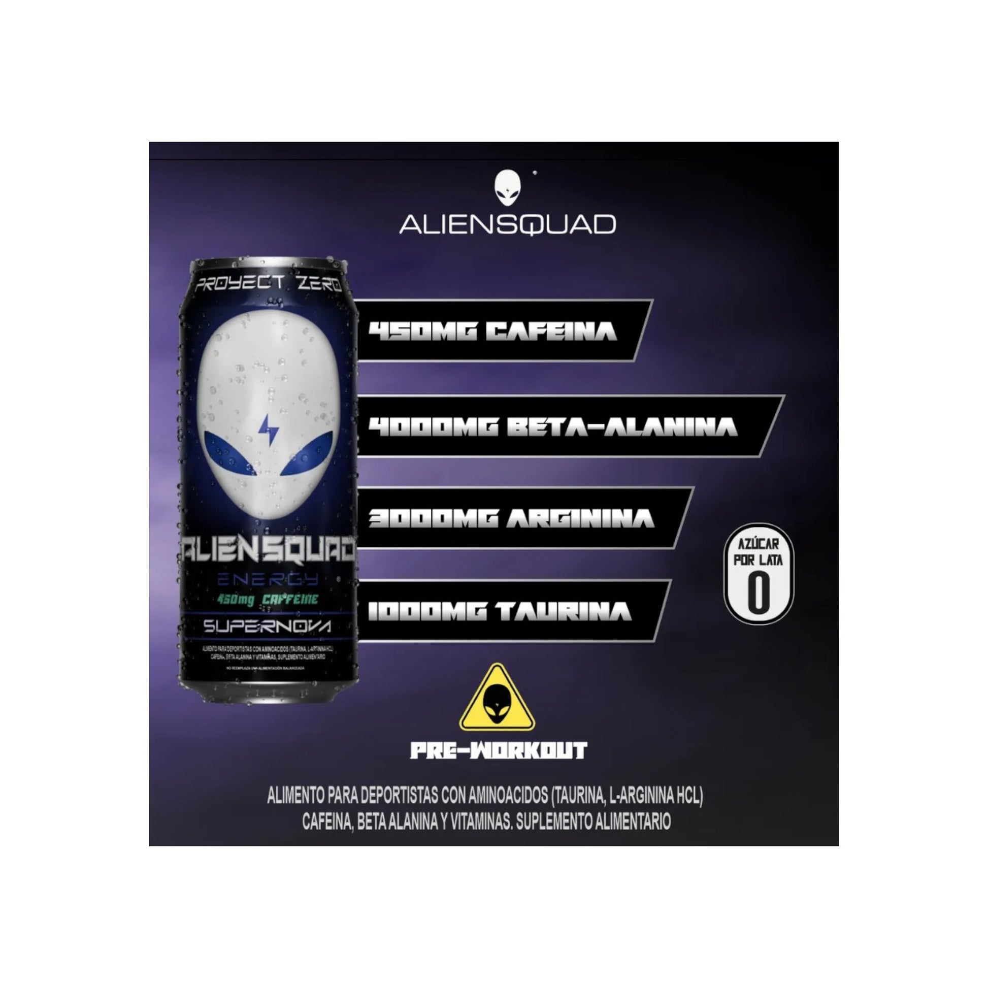 Prepárate para entrenar como nunca con Alien Squad en formato líquido. ¿OG, OG EXTREME o SUPERNOVA? OG te da 250mg de cafeína, OG EXTREME te da 400 mg de cafeína, SUPERNOVA 450 mg y 0% azúcar en la versión más explosiva. Ambos combinan beta-alanina y arginina para energía, enfoque y resistencia que te acompañan durante toda la sesión. Una lata al día, y recuerda: menor de 15 años, embarazo, lactancia o diabetes deben evitar su consumo. ¿Listo para llevar tus entrenos al siguiente nivel? Elige tu sabor y ¡vamos con todo!